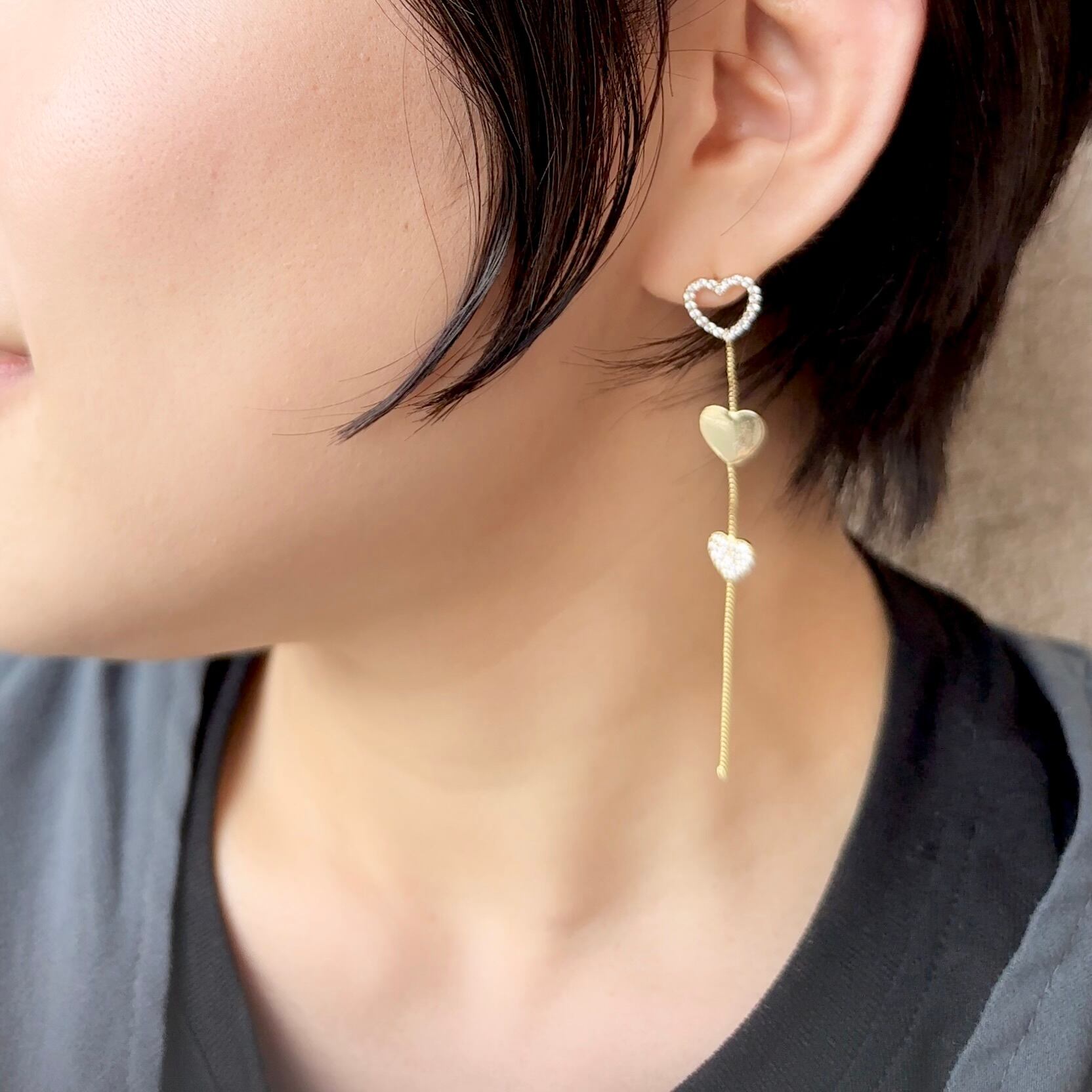 3つの異なるハートが揺れるデザインであなたの耳元に華やかさをプラスします 素材…チタン(ポスト&キャッチ部分)、合金+金メッキ、クリスタルガラス サイズ…H7.8cm×W1.1cm